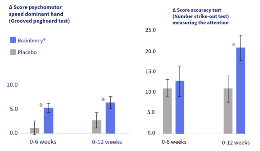 | Brainberry® (Aronia Berry Extract) 65 mg | • Improves focus and reaction time* | Brainberry® is a standardized extract of Aronia melanocarpa rich in cyanidin-3-O-galactoside, a powerful anthocyanin. Clinical studies (by BioActor) show improved sustained attention, reaction time, and hand-eye coordination in as little as 6 weeks. Mechanistically, it supports neuronal signaling efficiency and mitochondrial activity through improved blood flow and antioxidant protection in the brain. |