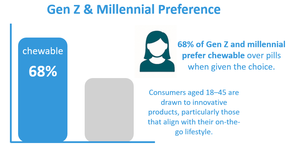 Market Data: 68% of millennial supplement buyers prefer chewables over pills when given the choice. The 18-39 age demographic is driving format innovation across categories. These buyers want products that fit their experiential, lifestyle-driven mindset — convenient, enjoyable, and designed for life on the go.