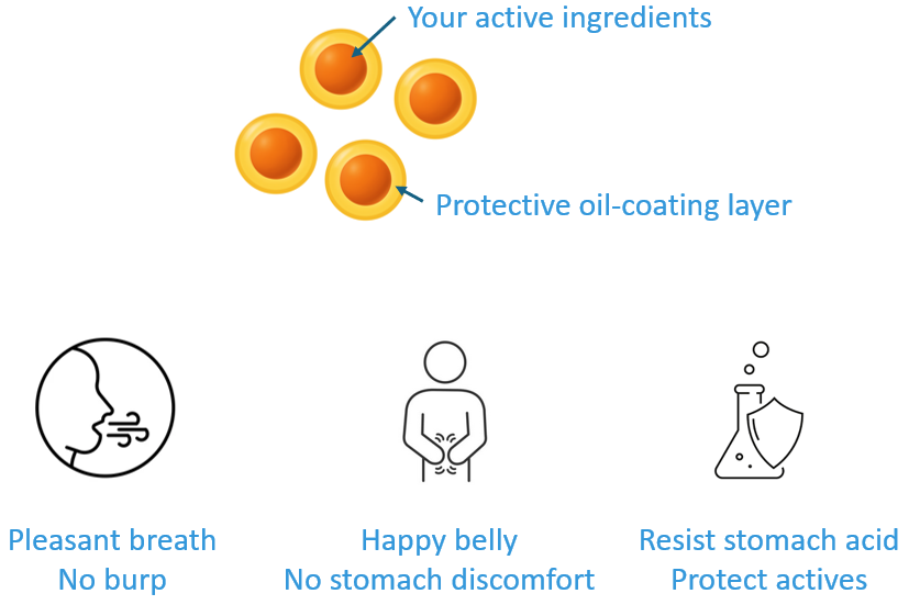 - Prevents premature degradation in stomach acid (no burps or gastric discomfort).