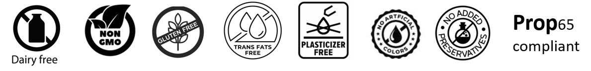 ✅ Non-GMO ✅ No major allergens ✅ Gluten-free ✅ No plasticizers ✅ No artificial colors ✅ No preservatives ✅ Prop 65 compliant