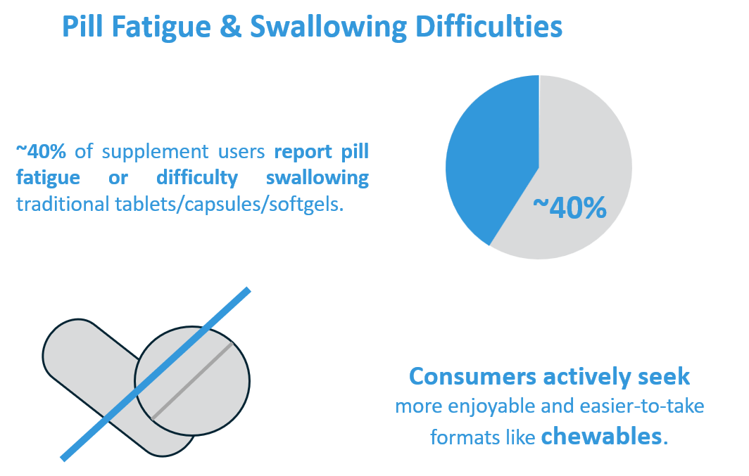 The Industry Challenge: Around 40% of supplement buyers report pill fatigue or difficulty swallowing traditional tablets or capsules. When supplements are unpleasant to take, users abandon them — and brands lose repeat sales.